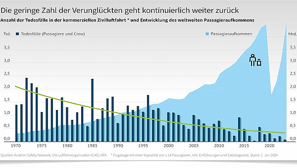 2023 war eines der sichersten Jahre in der Geschichte der Luftfahrt. Die Zahl der tödlich Verunglückten in der zivilen Luftfahrt ist langfristig stetig rückläufig, obwohl die Zahl der Passagiere gleichzeitig steigt. Seit jeher ist in der Luftfahrt der Grundsatz verankert, dass Sicherheit absolute Priorität hat – auch weil immer wieder Prozesse angepasst und weiterentwickelt werden.