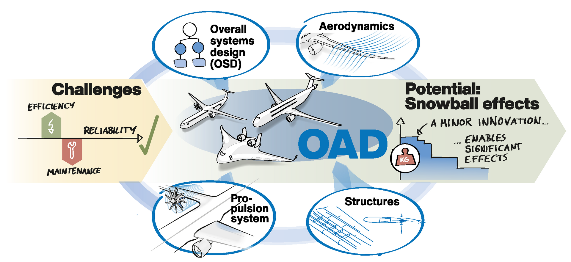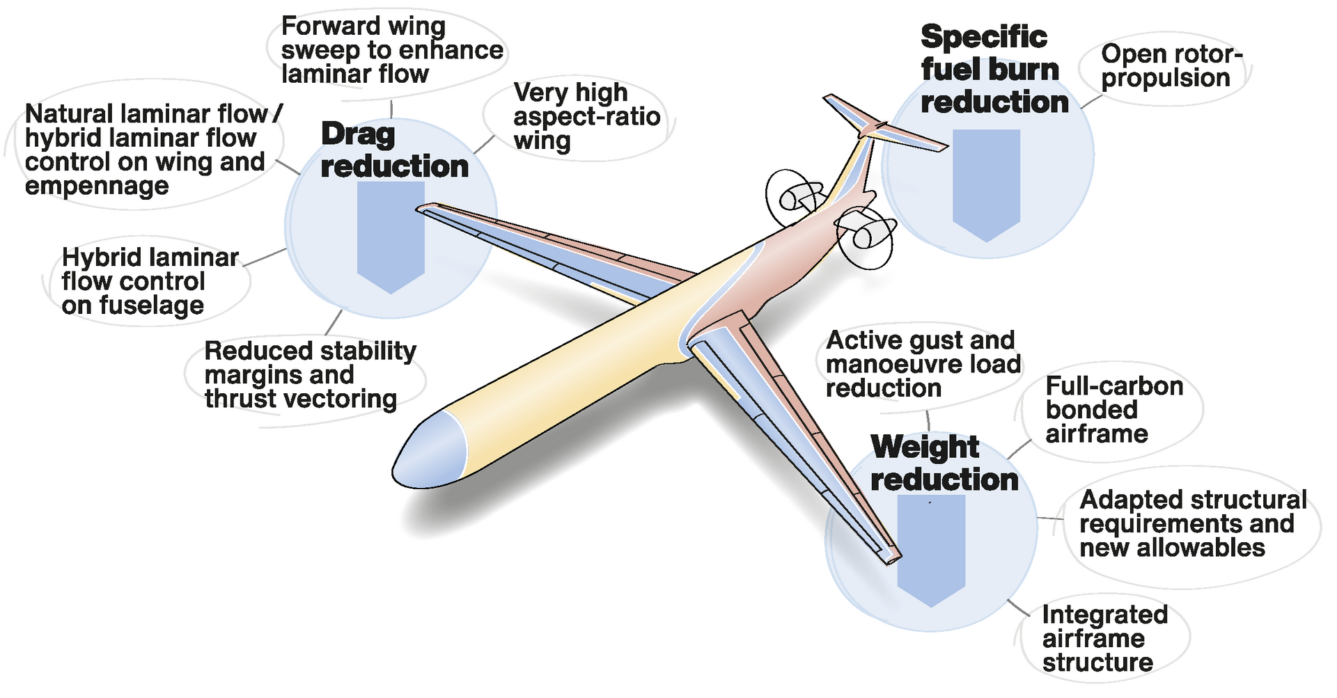 Die Integration der verschiedenen Technologien in eine bestimmte Flugzeugkonfiguration wird letztendlich das volle Potenzial aufzeigen. Je nach Konfiguration können Synergien mehr oder weniger genutzt werden und Nachteile fallen bei einigen Konfigurationen stärker ins Gewicht als bei anderen. Folglich stellt die Flugzeugkonfiguration immer den besten Kompromiss einer Vielzahl von Technologiebausteinen dar, um das wettbewerbsfähigste Flugzeug zu erhalten. Die heutigen, klassischen Tube-and-Wing-Konfigurationen stützen sich auf die größte Erfahrung in Konstruktion, Produktion und Betrieb. Weitere Verbesserungen sind durch Flügel mit höherer Streckung, Triebwerke mit höherem Bypassverhältnis (BPR), höhere strukturelle Effizienz und Maßnahmen zur Verringerung des viskosen Widerstands möglich.