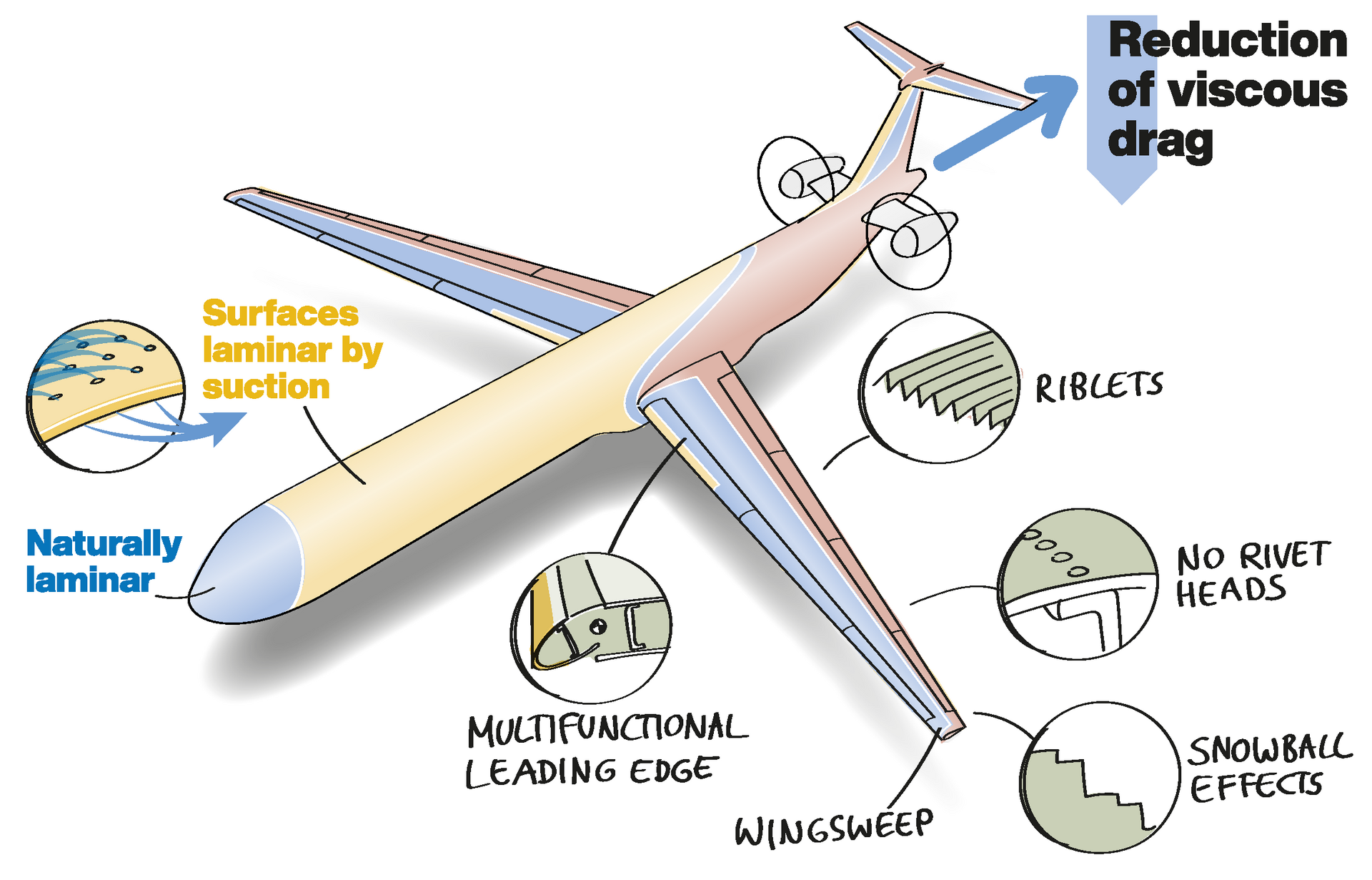 Weit mehr Potenzial als Riblets verspricht die Laminarisierung der wichtigsten Flugzeugkomponenten. Untersuchungen mittels Flugzeugvorentwürfen deuten darauf hin, dass damit der Gesamtwiderstand des Flugzeugs um etwa 40 bis 50 Prozent sinkt – sofern die Schneeballeffekte auf das Gesamtsystem Flugzeug berücksichtigt werden. Die Laminarisierung von Flugzeugen ist jedoch aufgrund der starken und vielfältigen Wechselwirkungen zwischen der Strömungsphysik, den geeigneten Flugzeugstrukturen und dem Design der Absaugsysteme sehr komplex. Der Mangel an grundlegenden Kenntnissen über geeignete angepasste Strukturen für die Hybridlaminarhaltung (HLFC), industrieller Erfahrung in der Auslegung resilienter Systeme und Wissen über eine kosteneffiziente Produktion führt zu erheblichen technologischen Risiken. Diese Lücken können nur durch strategische, langfristige Forschungsmaßnahmen verkleinert und geschlossen werden.