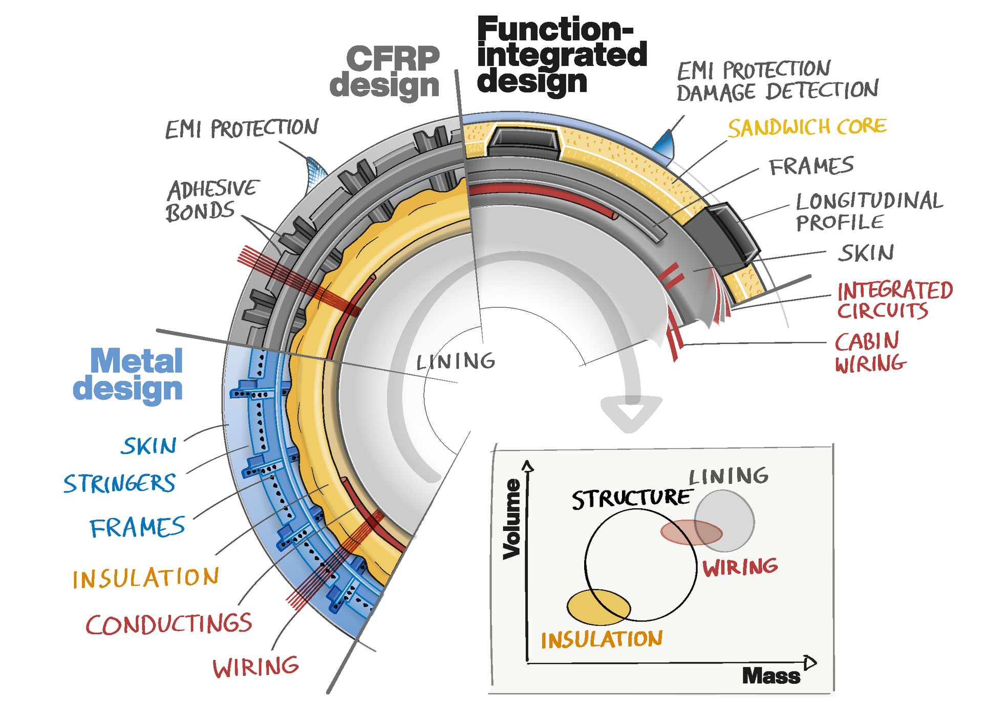 Die Struktur der Flugzeugzelle ist der Schlüssel zu weiteren erheblichen Gewichtsreduzierungen, aber auch zu funktionalen Fähigkeiten, die mit klassischen Konstruktionen nicht erreicht werden können. CFK wird hier eine wesentliche Rolle spielen. Trotz der erfolgreichen Einführung von CFK haben Aluminium-, Stahl- und Titanlegierungen immer noch einen Anteil von etwa 50 Prozent am Flugzeuggewicht. Dieser Materialmix begrenzt das Potenzial für zusätzliche Gewichtseinsparungen. Mit dem Einsatz von CFK sind Gewichtseinsparungen bei der Primärstruktur durch eine vollständig geklebte Zelle sowie durch überarbeitete Konstruktionsanforderungen möglich. Auch kann durch Funktionsintegration die Leistung der Zelle verbessert werden.
