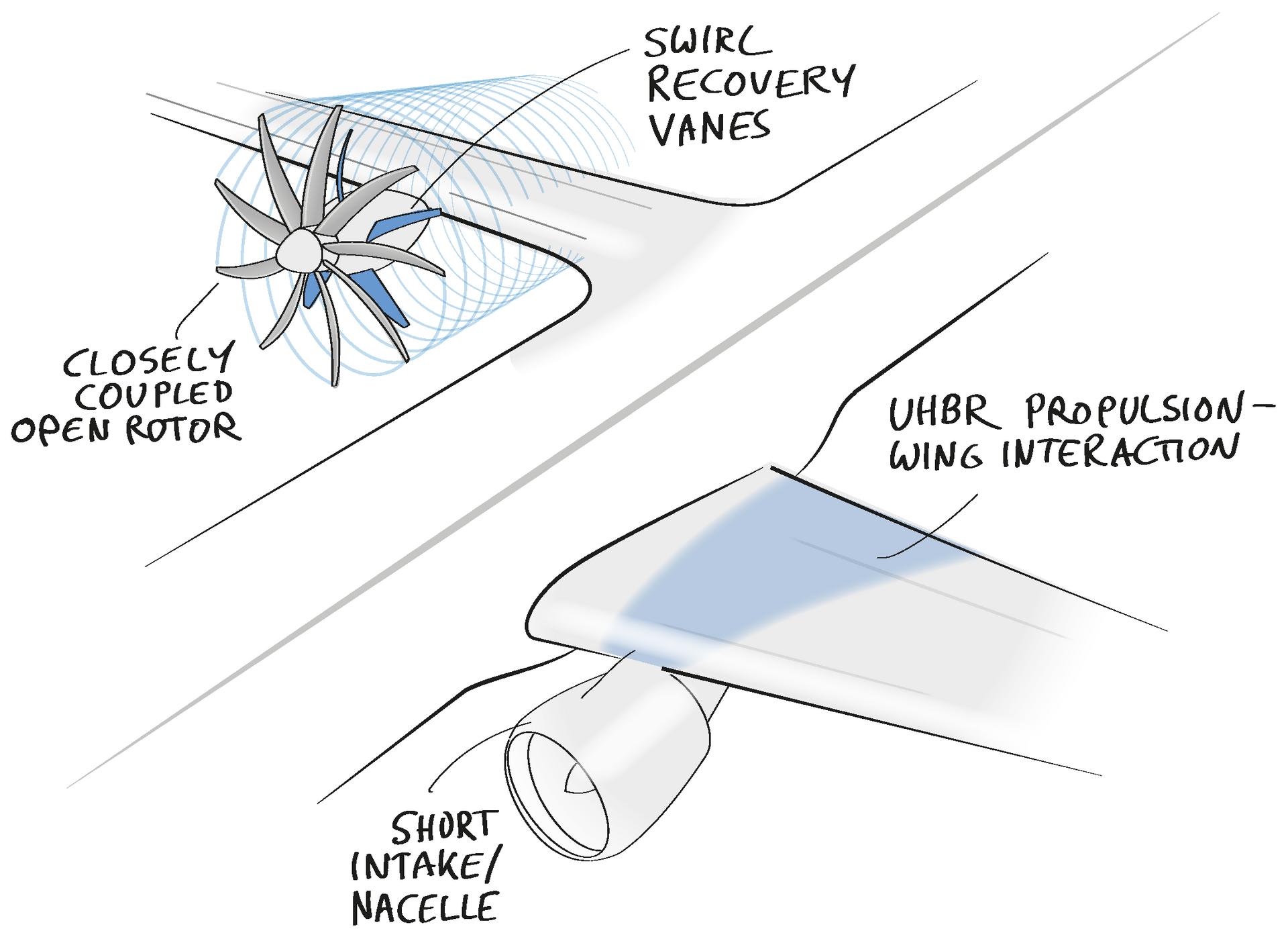 Mehr synergetische Ansätze ermöglichen auch eine höhere Effizienz in der Antriebsintegration. Zukünftige Triebwerkskonzepte werden deutlich erhöhte Bypassverhältnisse durch ummantelte (Ultra High Bypass Ratio, UHBR) oder offene (Open Rotor, OR; Contra Rotating Open Rotor, CROR) Antriebe aufweisen. Diese erfordern eine sorgfältige Integration, da die stärkere aerodynamische Kopplung der Zellenaerodynamik mit der Umströmung des Antriebs ausgenutzt werden muss. Darüber hinaus könnte die Grenzschichteinsaugung in den Triebwerkseinlauf (Boundary Layer Ingestion, BLI) dazu beitragen, die negativen Auswirkungen des viskosen Widerstands am Rumpf zu verringern, und so die Gesamteffizienz des Antriebs verbessern. Dazu müssen der Einlauf und der Propulsor allerdings eine zusätzliche Dimension der Ungleichförmigkeit der Strömung bewältigen.