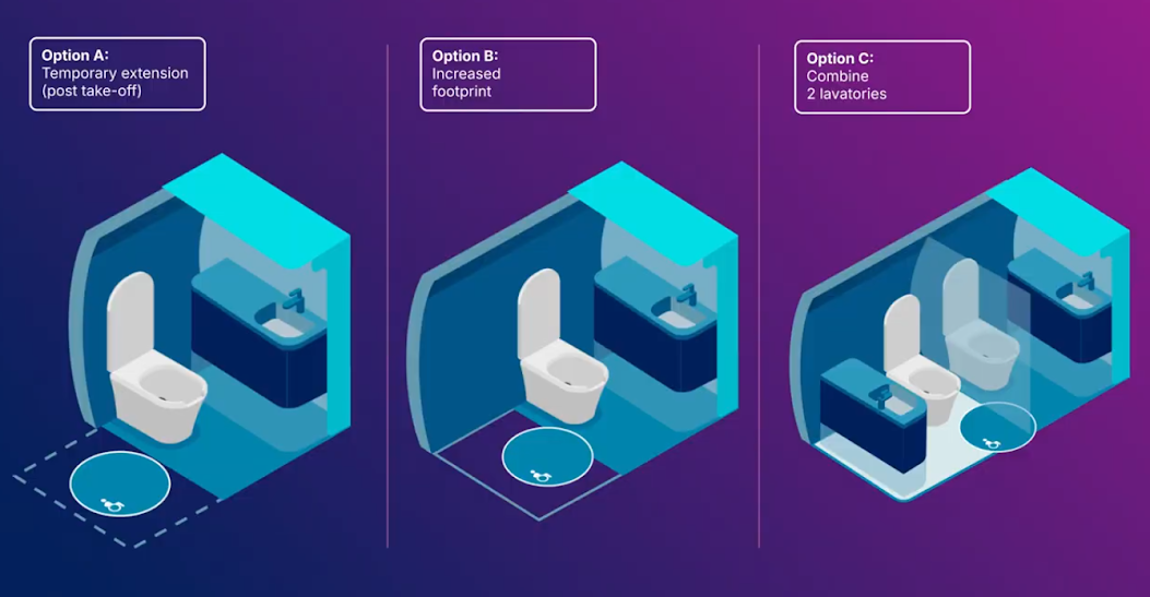 In einem zweiten Schritt erfordert die neue Generation von Toiletten zusätzlich ausreichend Platz für einen von einer großen Assistenzperson unterstützten Transfer. Solche Toiletten sind nach US-Regeln ab dem 2. Oktober 2033 vorgeschrieben. Aufgrund des begrenzten Platzes in kleineren Flugzeugen kann jedoch die Grundfläche von Toiletten nicht ohne Weiteres vergrößert werden. Sie dürfen schließlich im Fall einer Evakuierung nicht in die erforderlichen Fluchtwege hineinragen. Außerdem muss noch genügend Platz sein, damit effiziente Kabinenabläufe gewährleistet werden können.