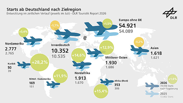 Das Deutsche Zentrum für Luft- und Raumfahrt (DLR) hat den DLR Touristik Report zum Sommer 2026 veröffentlicht. Die Analyse prognostiziert für Juli 2026 rund 74.100 Starts ab Deutschland – ein Plus von 1,6 Prozent gegenüber 2025, jedoch weiterhin 16,8 Prozent unter dem Niveau von 2019. Ein Treiber der Entwicklung bleibt der touristische Luftverkehr, der das Vorkrisenniveau deutlich übertrifft.