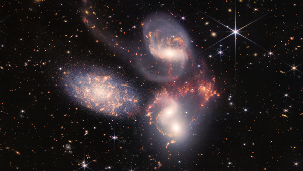 Stephans Quintett: Sterne entstehen aus Gas und Staub, die in großen Mengen um Galaxien herumschwirren, und tragen zu deren Entstehung bei. Der Staub verändert sich mit der Zeit, und das James-Webb-Teleskop kann nahe gelegene und dynamisch interagierende Galaxien untersuchen, um den Staub in Aktion zu sehen. Nun können Wissenschaftler:innen einen seltenen Einblick in noch nie dagewesener Detailtiefe erhalten, wie interagierende Galaxien die Sternentstehung ineinander auslösen und wie das Gas in diesen Galaxien gestört wird.·