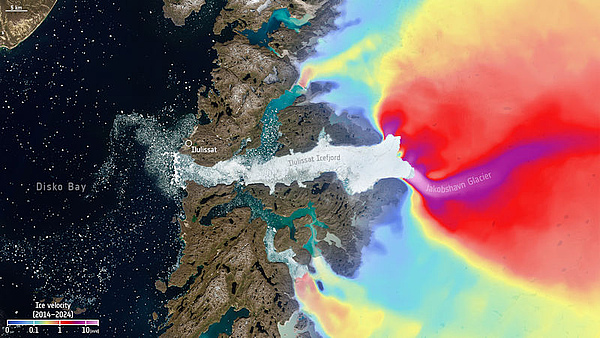 Die Studie zeigt den schnellen Eisfluss mit einer Durchschnittsgeschwindigkeit von bis zu 15 Meter pro Tag von Gletschern und Eisschilden an verschiedenen Punkten rund um den grönländischen Eisschild. Auf halber Höhe der Westküste Grönlands liegt Sermeq Kujalleq, auch bekannt als Jakobshavn-Gletscher, einer der schnellsten Auslassgletscher der Welt mit Geschwindigkeiten von bis zu 50 Meter pro Tag.