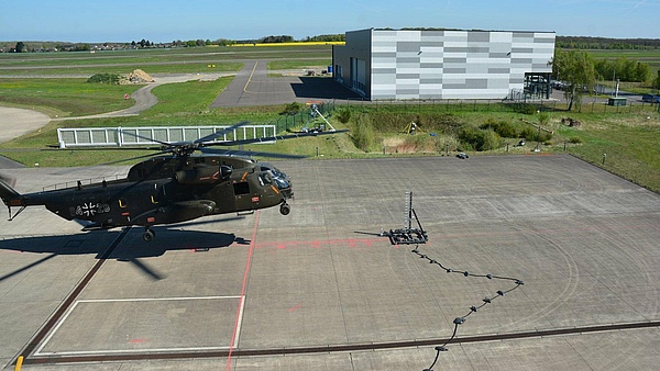 Der Sikorsky CH-53 zählt zu den größten Transporthubschraubern und kann intern bis zu 5500 Kilogramm Nutzlast transportieren. Für die Versuche am DLR-Standort Braunschweig hatte der Hubschrauber ein Abfluggewicht von 14 Tonnen. Die Maschine flog dabei in zwei bis zwölf Metern Höhe über dem Boden im Schwebeflug. Drei Hochgeschwindigkeits-Kameras nahmen aus verschiedenen Blickwinkeln die dabei entstandenen Luftwirbel an den sechs Rotorblättern auf. Zwei weitere Kameras bestimmten die Position der CH-53 mit hoher Präzision.