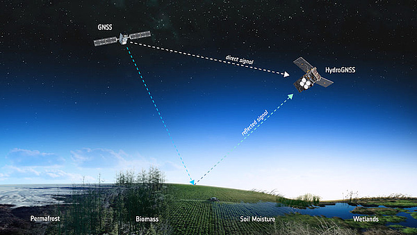 Navigationssatelliten wie GPS und Galileo senden L-Band-Mikrowellensignale aus, die sich ändern, wenn sie von der Erdoberfläche reflektiert werden. HydroGNSS soll diese reflektierten Signale mit den direkten GNSS-Signalen vergleichen, um wertvolle Informationen über geophysikalische Parameter im Zusammenhang mit dem Wasserkreislauf zu gewinnen.