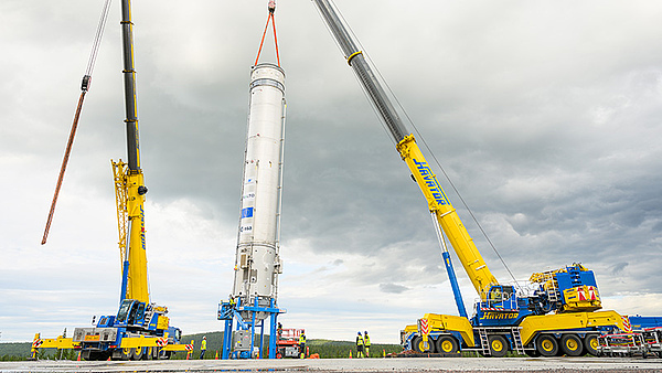 Das erste Modell des wiederverwendbaren Raketendemonstrators Themis der Europäischen Weltraumorganisation ESA steht auf seiner Startrampe in Kiruna, Schweden.