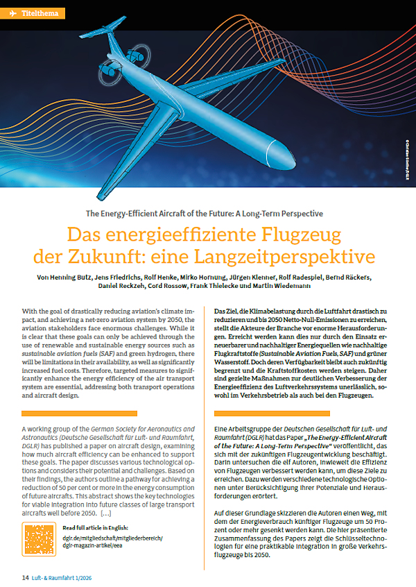 In dieser Ausgabe der „Luft- & Raumfahrt“ und in unserem Onlineportal finden Sie einen Bericht über dieses Dokument (auch auf Englisch). Das vollständige Paper können Sie auf dglr.de/eea-paper herunterladen.